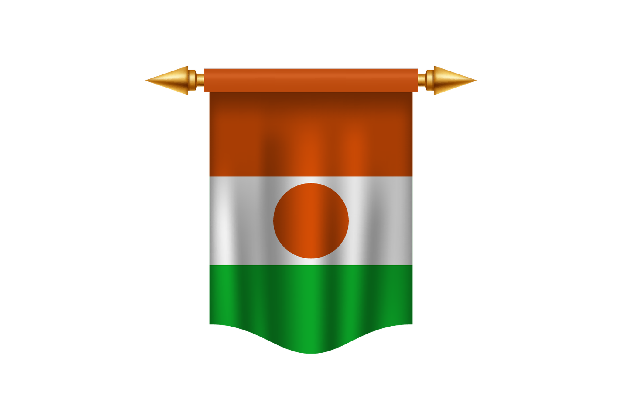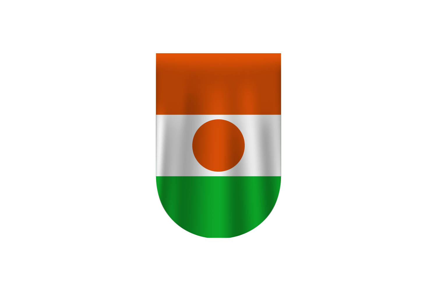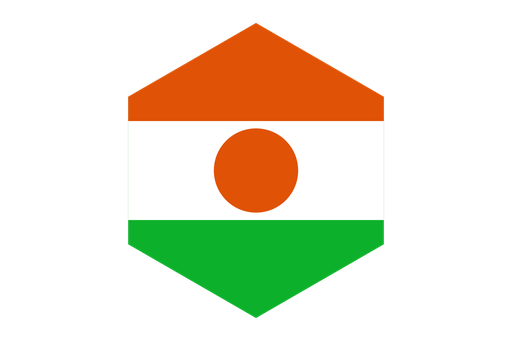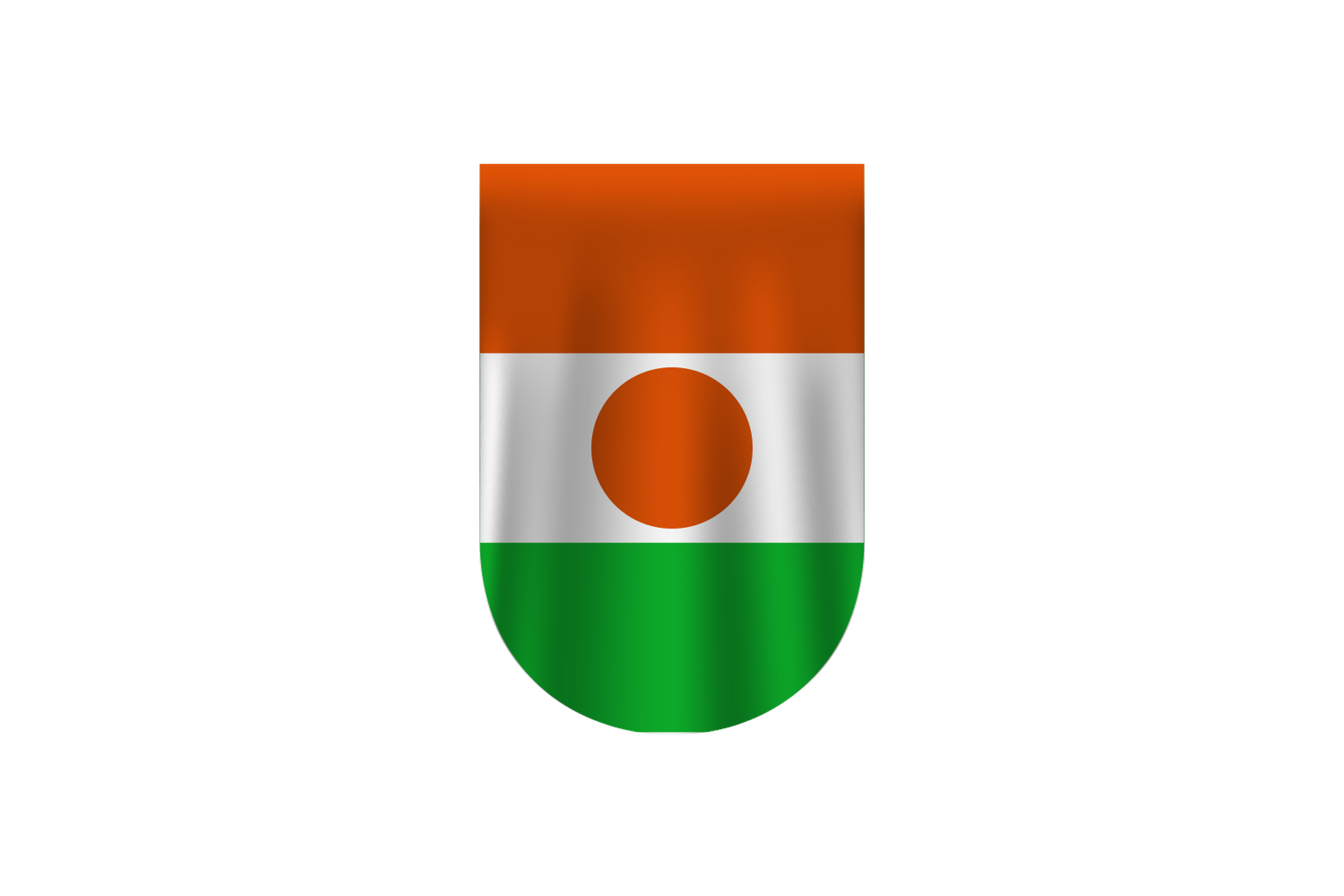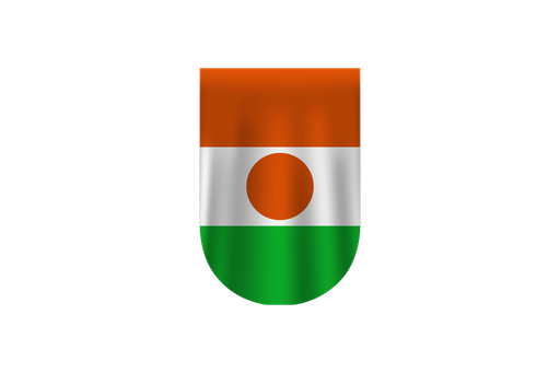 The orange, white, green, and orange horizontal bars of the flag of Niger have a central orange circle. The orange stripe stands for the Sahara desert of northern Niger, for Courage and Strength. The green on the flag represents the fertile south, the white the purity and peace. A traditional shield in the form of an orange circle, namely a 'tamat' or traditional shield, is called a symbol of unity and independence.