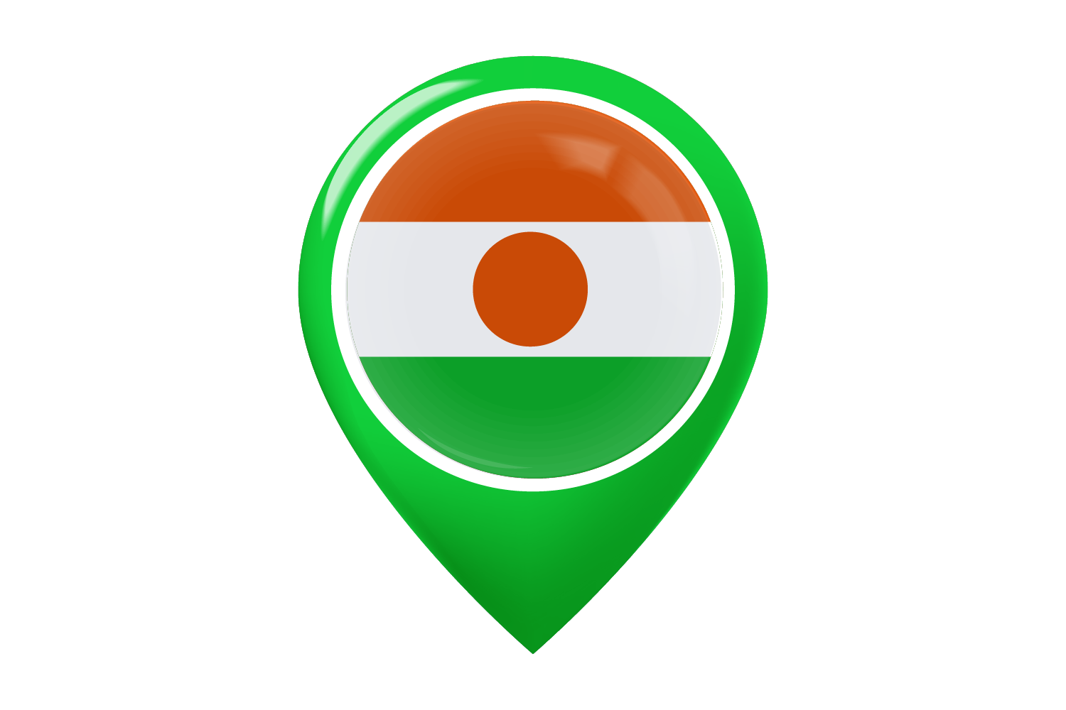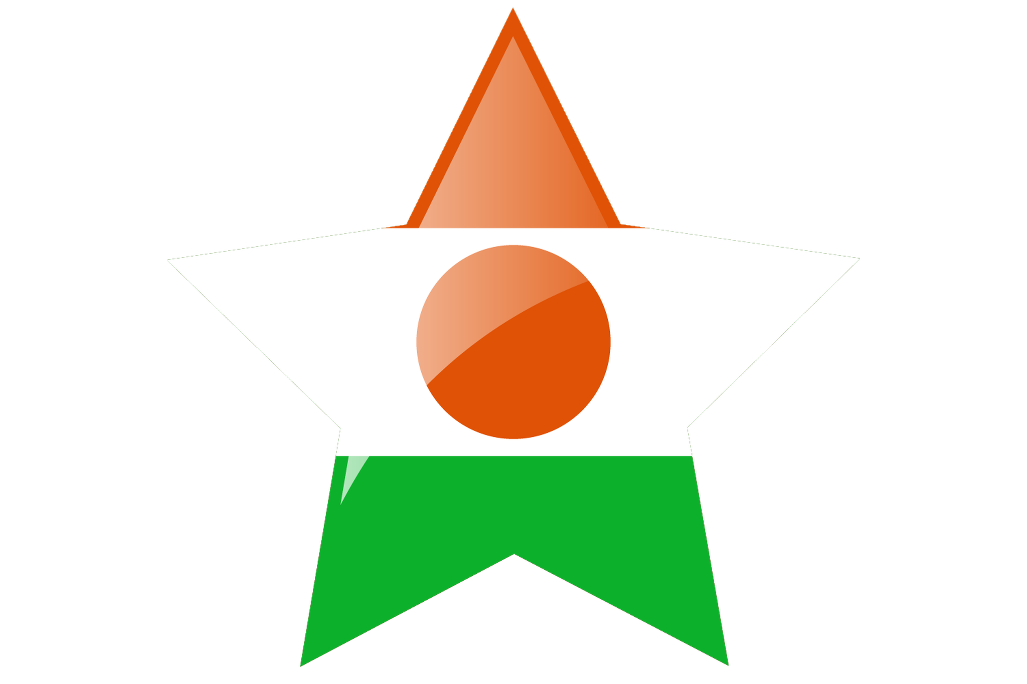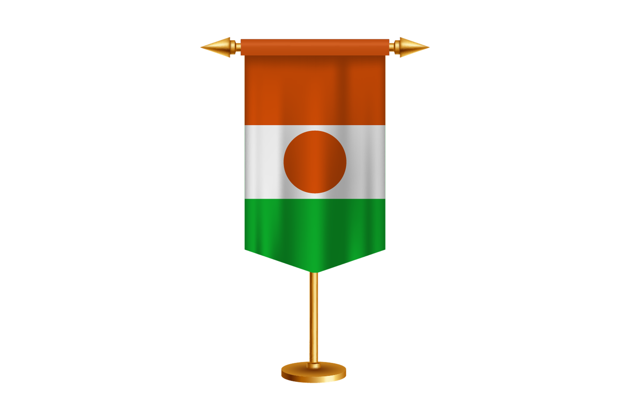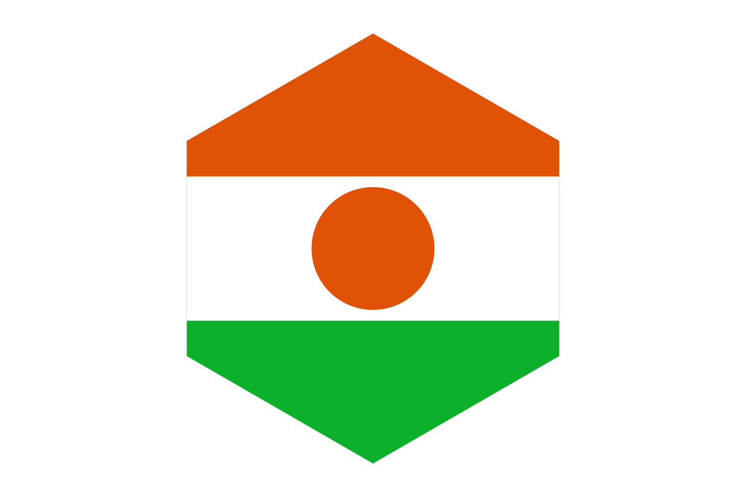 The orange, white, green, and orange horizontal bars of the flag of Niger have a central orange circle. The orange stripe stands for the Sahara desert of northern Niger, for Courage and Strength. The green on the flag represents the fertile south, the white the purity and peace. A traditional shield in the form of an orange circle, namely a 'tamat' or traditional shield, is called a symbol of unity and independence.